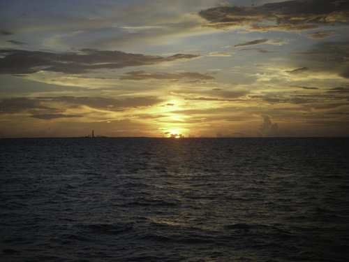 As campers for Dry Tortugas we were told to be on the pier by 6:30 am. We were guests at the Naval Air Station Key West Truman Annex and walked to the corner of Greene and Elizabeth St for a ride on Sunny Days Catamarans dragging our cooler, camping and snorkeling gear, and gallons of water. When the crew arrived after 7:00 am, they were surprised to see us there so early. The crew packs the gear at the front of the boat and out-of-the-way. We sat outside with sunglasses on and cameras ready.