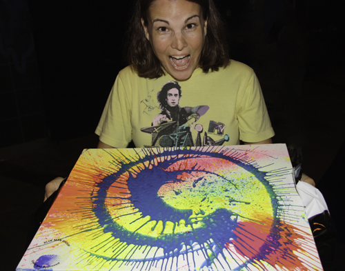 Onto the second act after the paint and drumming. There was a bag of marshmallows and a gum-ball machine. A guy in the middle to throw and a guy on either side to catch. One catches a gum-ball, full of paint, and decorates a canvas. The other guy, unknowingly, catches a marshmallow and attempts to decorate a canvas. The competition ends with paint all over one canvas and a marshmallow stack of at least 18, that was built in the guys mouth, stuck to another with a price tag of $4,000. If you can’t tell, the picture above is me with the painted canvas. I thought about wanting it during the show, but was sure that someone else would claim it. Also, I was unsure of the asking price; more on this later.