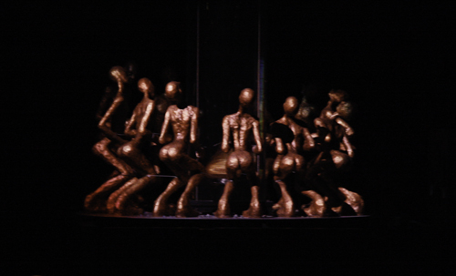 There are little bronze-looking bodies on either side of the stage with their booties showing and I take some pictures. Later these booties will be dancing under strobe lights. The people in front put on their plastic ponchos in case of flying paint. On the wall are message LED signs that are incorporated into the show, “Please take a moment to turn off all palm pilots, pagers, gameboys, cell phones, laser pointers, laptops, and portable fax machines…Thank You.” The signs will go on to announce a birthday, a headache, and someone’s Facebook update status.
