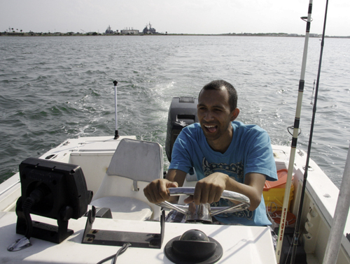The guys do not tire easily and, ensuring they are again left with only little fish, jump back in. I try to get a good picture of the waves crashing over the rocks and after Rivera makes a show of watering the ocean the other two are ready to go. I will get some pictures of roseate spoonbills flying in the distance with plenty of gulls and pelicans close-up. I enjoy seeing how my pictures turn out after bouncing around and pointing somewhat aimlessly. I hope to get a chance to swim with the manatees and dolphins on another trip.