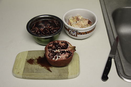 The dogs ate while I showered and then I was hungry. I love buying fresh, non-packaged items, but sometimes packaged things can be eaten more quickly. I had gone to the fridge and had multiple fruit options and chose the pomegranate. Had I chosen any other fruit I would have filled my hunger quickly. 20 minutes later and I’m about to give up and eat something else but I can’t just leave it lying there, half done, so I take a picture instead.