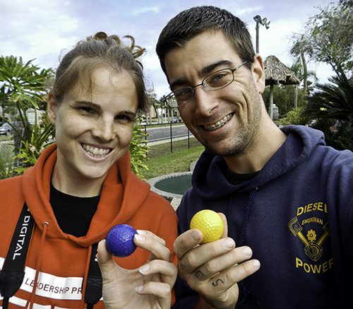 We pass some alligators on our way in to get some balls for golfing. Along with our ice skating ticket we are allowed to pick putt-putt, laser tag, or go-carts. I thought about the go-carts but I think the next time I want to go fast I will try for the adult race track or the autobahn. We each get a ball and I stop counting putts – I’m not that good. Caleb gets a hole-in-one. The last hole returns your ball but I wasn’t ready to go.