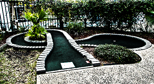 We explore the other 18-hole course and find some misplaced balls. The putters are left outside so we return to grab them, fish the balls out, and continue the next course. We lose our balls on hole-4 and an employee dumps water through the pipe to clean out seven balls in there along with ours. We finish this course too and it’s time to skate. There aren’t too many people on the ice which is good; it will give me more room to fall.