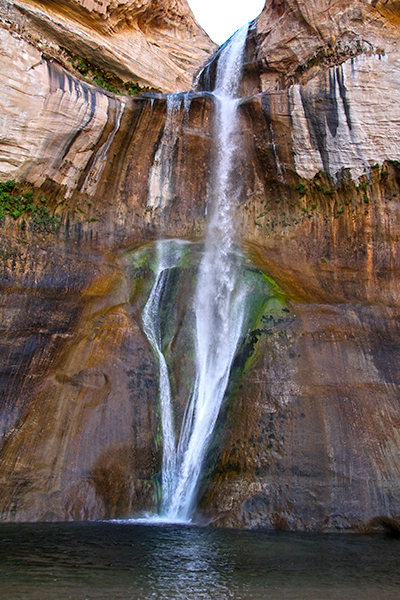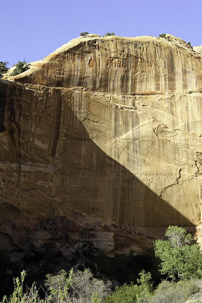 Fifty miles east on Hwy 12 brings us to Calf Creek Campground where the trailhead for Lower Calf Creek Falls is located. We arrive at 4:00 pm and hike, in sun and shade, the three miles to the 120ft waterfall. We are able to see pictographs on the other side of the canyon. Upon reaching our destination at 5:30 pm there are five other dogs playing in the water and muck. I take my photos, take the dogs while Caleb takes his, and then we walk upstream a bit and toss the dogs in there.