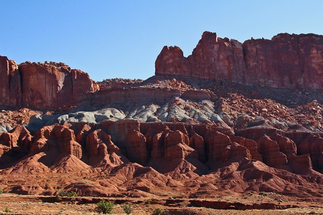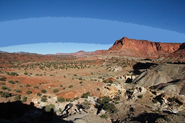 Up at 6:00 am, we stop at the intersection of Hwy’s 12 and 24 to get coffee at the Subway gas station, walk by the closed visitor information center, and get a huge cinnamon roll at the café. After some sugar and caffeine it’s time for our first hike of the day up to Chimney Rock at Capitol Reef NP. The parking lot upon return seems to be filled with the same cars that followed us into the gas station. We are but moments from a crowd; I can appreciate the small parking lots more when I realize the sounds they help to reduce.