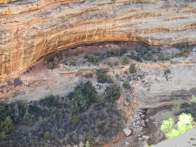 Lake Powell is beautiful though. The rocks and water go up and down and around each other. We are able to see a lot of this from the curvy road and dusty stops. I can just imagine the view from on the river. We continue to Natural Bridges and are able to drive the nine-mile loop and do some hiking while the dogs wait in the shaded car hiding from the 84 degrees of heat coming from the sun. We refill two water jugs at the visitor center while eating mangoes for lunch – a juicy, messy treat on a hot day.