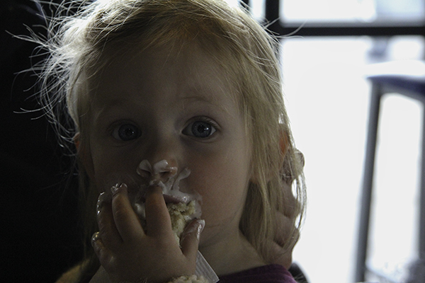 We choose a table outside and quickly put our jackets back on – we had warmed up from the hike. Sammi entertains us by dipping her Doritos into her mason jar full of water. When our food arrives we decide to move inside so we can be warmer while we eat. Sammi will now take some of the turkey from her sandwich and dip that in the water too. Not to be outdone Lyra starts by dipping the same piece of bread gut in ranch sauce and eating the condiment from the carb and re-dipping.