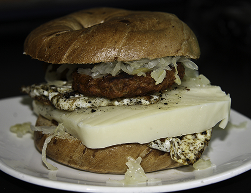 cinnamon raisin bagel with sausage, egg, mozzarella, and sauerkraut