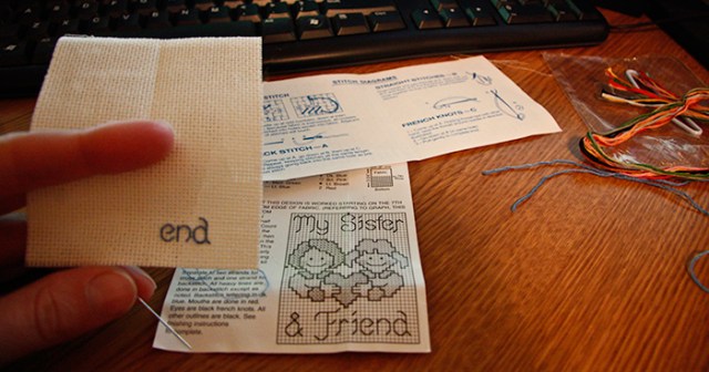 After reading the ‘easy to follow instructions’ I will begin to create my version of this counted cross stitch creation. I was to use two threads, but used one twice instead. Pictured above is back-stitch – make a stitch (colored thread appear between two holes in the fabric) and then insert needle into the same hole as the previous stitch for the next.