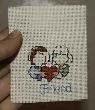I wish the thread-makers would have lengthened the thread by an inch or two. Many times (the F, the heart, the blue collar) I would need 4-22 stitches more and it was knotting a new thread to the needle that was the most difficult. The designer gave me enough fabric to not worry about counting stitches, go with my design, use all the thread, and still have enough room for all the mistakes I made – though I did try counting.