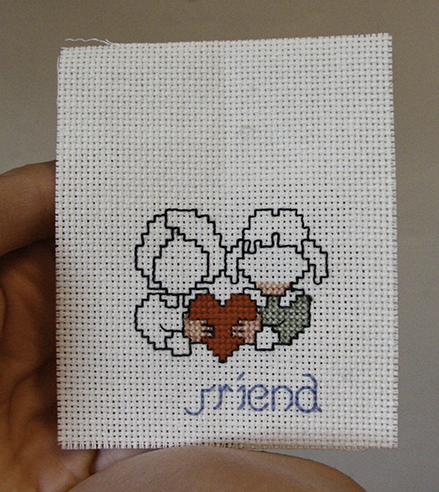 The eyes are of my design. I couldn’t grasp the french knot concept – bring thread up, twist, and put back down the same hole. I attempted a back/cross stitch going through unmade holes in the fabric to have small eyes instead of X’s making them look dead. Three evenings later and my project is done. Now I can attach it to the hanger that was included with some tape or perhaps a bow-shaped stitch.