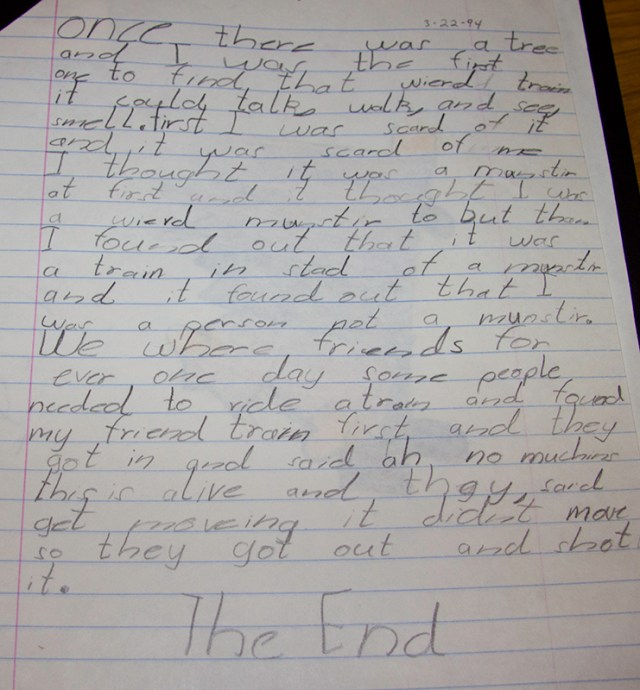 Once there was a tree and I was the first one to find that wierd train. It could talk, walk, and see, smell. First I was scard [scared] of it and it was scard of me I thought it was a munstir [monster] at first and it thought I was a wierd munstir to but than I found out that it was a train in stad [instead] of a munstir and it found out that I was a person not a munstir. We where friends for ever one day some people needed to ride a train and found my friend train first and they got in and said ah no muchins [machines] this is alive and they said get moveing it didn’t move so they got out and shot it. The End