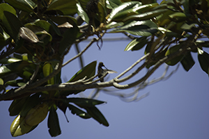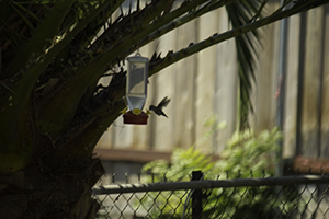I recently noticed some hummingbirds around the neighborhood and last week saw one in my backyard looking for food. Of course I ran to the store to buy a special jug with pretty flowers on it to bring him back. Add water and sugar, tie in shade, and wait. He showed up while the dogs were playing and didn’t stay long enough for my excitement to overcome me to get a decent photo. Then three days later he comes back – today! I’m out in the yard, near the feeder, and I hear a bird singing. I look around trying to find the voice.