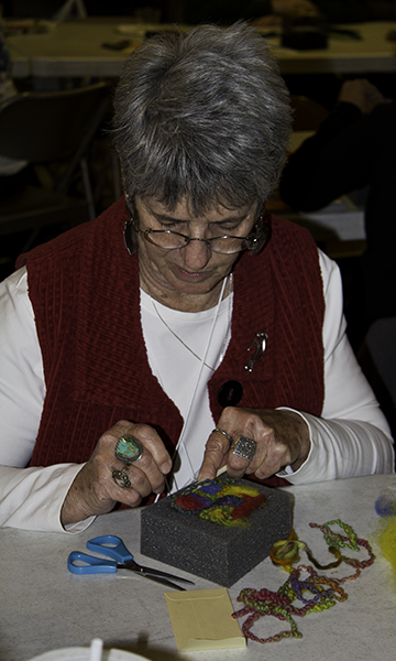 She showed us bags, shoes, bracelets, and a pin on her sweater – all including felted wool then gave us permission to cut and stab (if we happened to hurt ourself or others there was a volunteer band-aid nurse nearby). It’s a peace inducing process and there are so many creative possibilities that we (30 or so women and a couple men) spent at least an hour and a half working our creations between raffles, announcements, and show-and-tell.