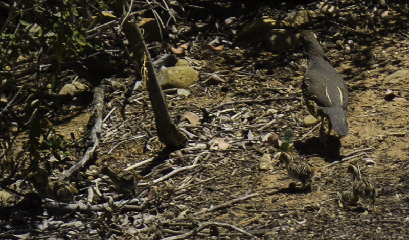 Today’s adventure would start out by turning right on Cowles Mtn. Blvd., left on Coleshill Dr., then a right on Barker Way where we park in front of one of the summit trails. On our way into the park we notice a mother quail (also the California state bird) with over six chicks – hard to count little running fuzzies that blend in with the ground that keep to the shadows and bushes in our presence.