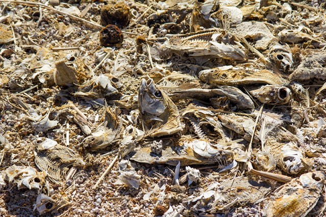 I’m off to a healthy start in the morning with two donuts from 7-11. I’m driving by a lake and thinking about how great it would be to put my feet in the water. I turn on the next road and park in front of a lady’s house with little barking dogs and make my way to the Salton Sea. It’s a good thing I put my shoes on (in case the rocks were hot) because the beach is made up of fish skeletons that have died from the salinity of the largest lake in California (by area).