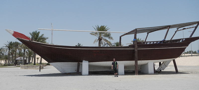 We first headed up to the Capital of Dilmun World Heritage Site. There is a giant archeological dig that you can walk around in and a museum with lots of cool exhibits. We walked around the entire place in the scorching 120 degree heat. After about two hours we were ready for something cold to drink so we headed back to the car. We drove east towards the airport because we had seen a boat by a bridge that we wanted to check out. We stopped at a store to get some water before visiting what turned out to be a children’s park. The boat turned out to be a large dhow (a big wooden boat – like a Viking ship – this one without the sail) sitting on blocks.