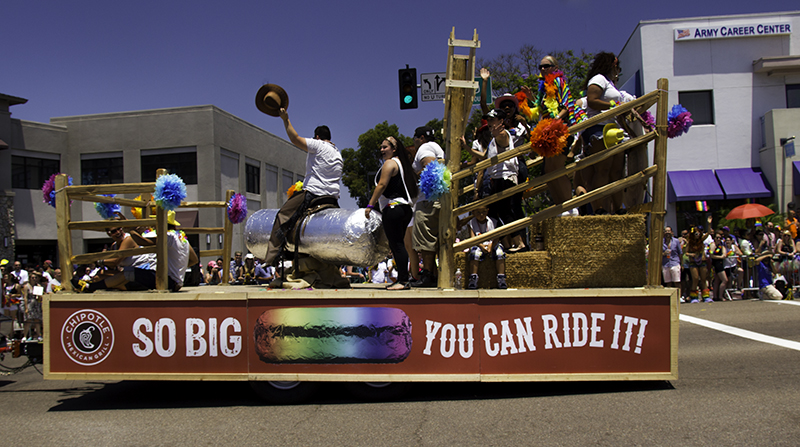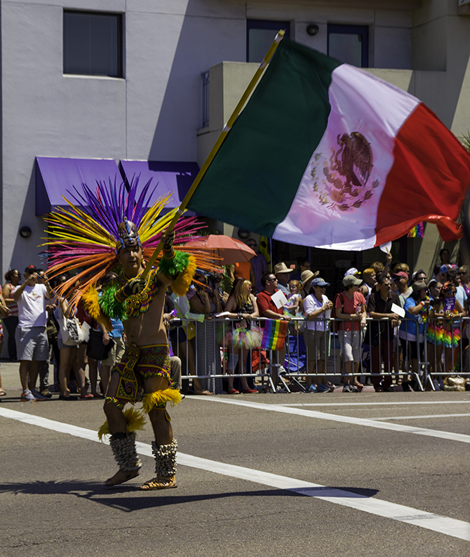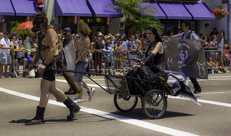 After Jack leaves at 9:00 am I will get dressed in my flamboyant attire to ride my bike to the parade with Betty. I’m wearing an orange shirt with a green plaid shirt over it, purple tights, rainbow socks, and neon pink shoes. I get to her house in Ocean Beach at 9:30 am. We take the bike path to Mission Hills where we will walk our bikes up some steep streets. We arrive in Hillcrest at 10:00 am and the sidewalks are packed with onlookers.