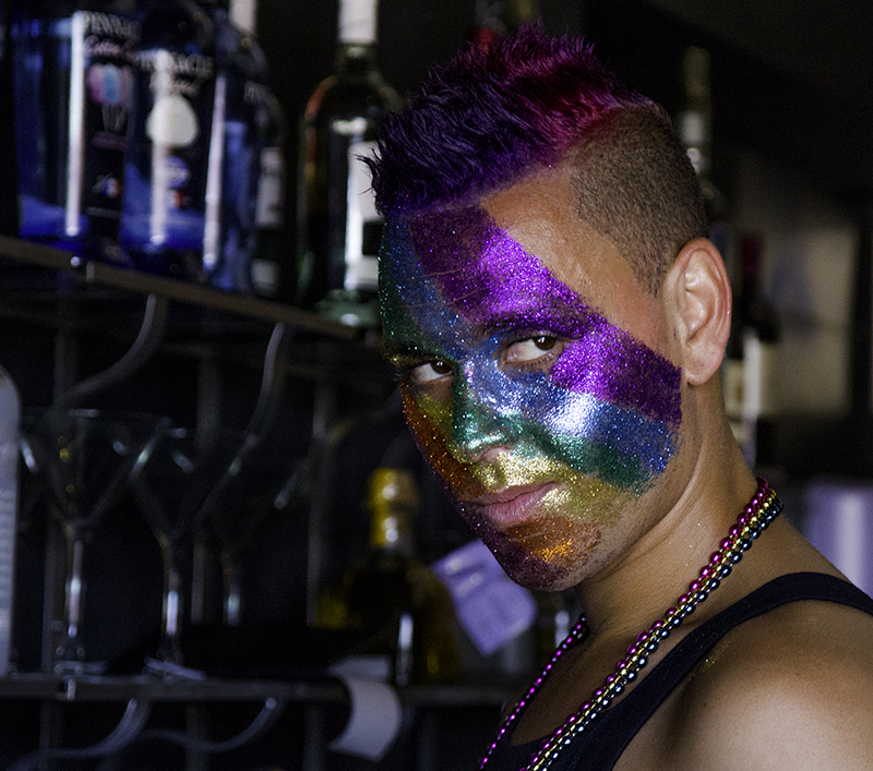 Also attending were government officials for support and equal rights, Amanda Lepore – a famous model and artist, and a variety of gay organizations and cultural groups. Passed out to the crowd were beads, condoms, cards, candy, fans, and bracelets. At 2:00 pm the parade is coming to a finish and we decide to find a place for lunch. We walk into a rainbow decorated bar halfway from the crowds at 2:30 pm and the wait is still too long.