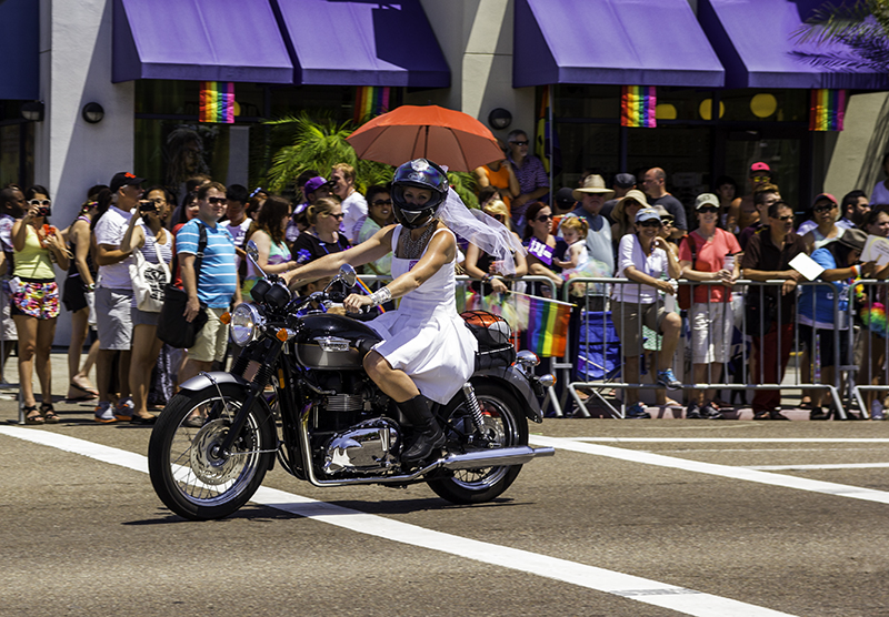 Betty comes back through the crowd. She has found a spot where we can lock our bikes and stand near the tape keeping the crowds back. Some people are wearing only underwear and others full robes and feathers. There are churches, banks, police, restaurants, and more out supporting the human race. And if the day wasn’t eventful enough – I got to watch a proposal and I wasn’t the only one crying – so romantic!
