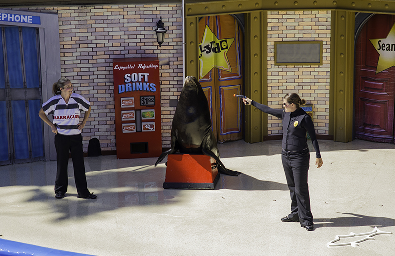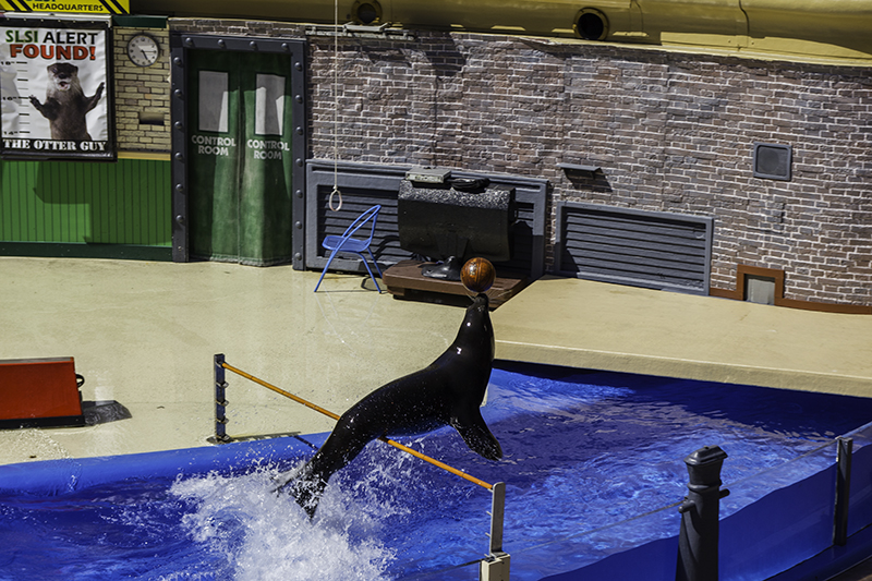 I finished my water ($3.01) and ate a Snickers ice cream bar ($3.88) while Biff did some costumed dancing to Singing in the Rain, the Oompa Loompa Song, Flashdance… What a Feeling, and You Should Be Dancing to name a few. Then they brought out Clyde and Seamore for a bit of friendly sea-lion competition – swimming with a basketball and dancing – with the help of their trainer and the delivery otter.