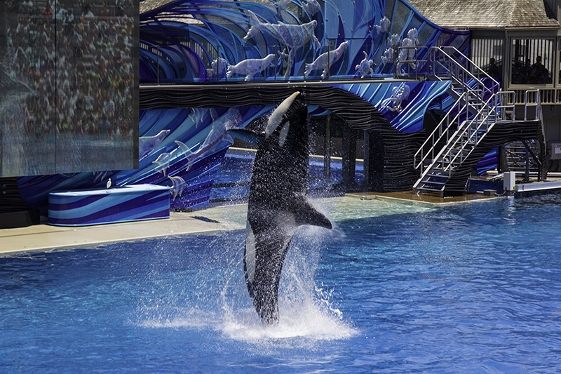 The pre-show entertainment will be a guy and his guitar singing about the greatness of parents bringing their kids to the porpoise performance. Dolphins, being the size of an Orca meal, are small enough to have ten swim in the tank with trainers during the show. They do synchronized jumps, flips, waves, and splashes; and one is able to ‘walk’ on water. Then out come the False Killer Whales (3rd largest member of the dolphin family) with the acrobats and birds trained to fly by.