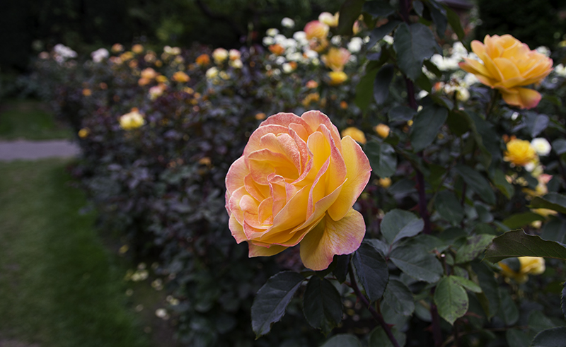 This is a large rose variety test garden where successes are released for commercial production and the others destroyed. The oldest rose was planted in 1943 by Grand Duchess Armstrong, one of thousands in a garden of 4.5 acres. We see every burst of sunset growing on these petals and shades of purple, blue, and bright pink. The only colors I don’t see are brown and green – perhaps too confusing with leaves and dirt. The red rose may be too popular for my liking, but this garden gains a certain reverence with me.