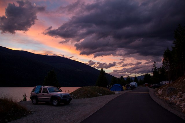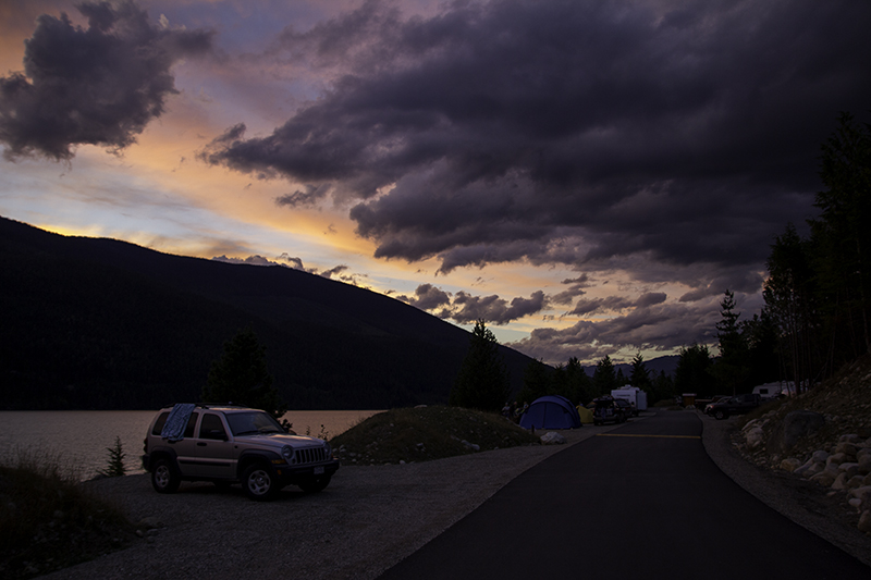 The sun may be behind the mountains, but the colors are in the clouds. We are set up between RVs and across from us is the rest of the birthday party from Banff that came out to celebrate someone’s 2,556 day on Earth, also known as their 7th trip around the sun. We take a lovely walk to the lake and enjoy a squirrel scurrying on the stones as we watch the clouds move. They really seem to be in a hurry in Canada and I think what a great time-lapse that would make, and even better if I could see the Northern Lights too.