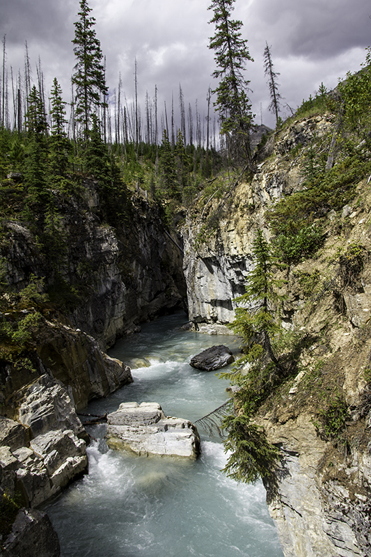 We stopped at Marble Canyon to see a waterfall, but on the other side of a gate we see a sign that says the other entrance to the Paint Pots is closed and this is the only way to access them – so we go. The other way may be shorter, but we are glad we didn’t miss out on turquoise-blue melted glacier, emaciated green trees and their burnt brothers, brown butterflies with a splash of white, and purple flowers amongst new undergrowth.
