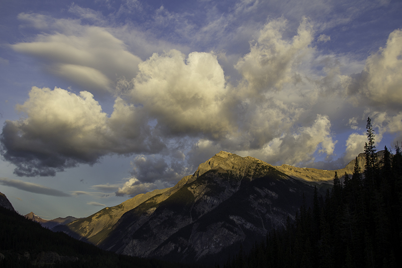 The sun and clouds have done so much by 6:00 am to inspire me with a spectacular view of colors and shapes over the mountains and trees. It seems like the blink of an eye and we are in Banff National Park on Bow Valley Parkway driving south in Alberta. Adjacent to the road we are on is Hwy 1 that has arch-shaped bridges built as animal overpasses with remote video cameras to keep an eye on which mammals are crossing and the ones setting up a colony, hoary marmot, in the area designed to be a natural extension of the park.