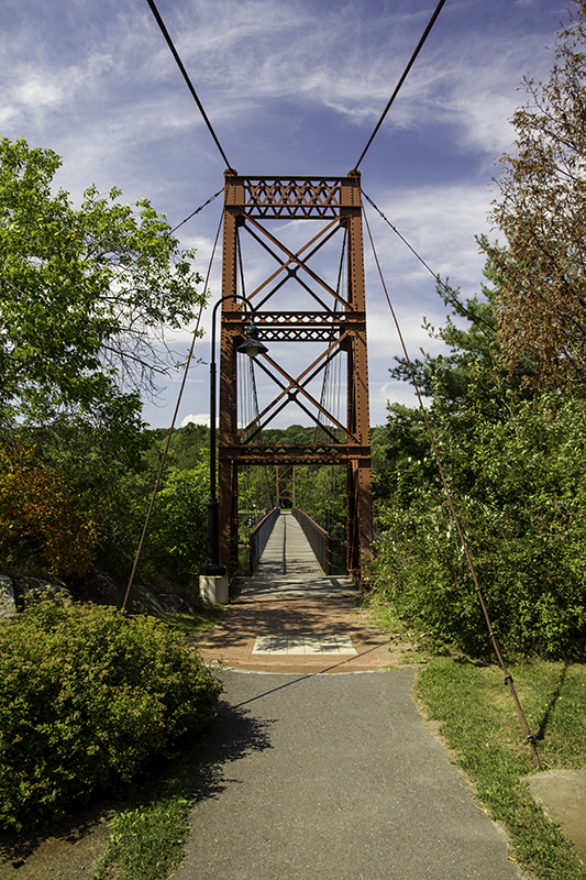 I saw a landmark sign and a parking lot big enough for five and turned around to get a look. The bridge was erected in 1892 of wire rope. It’s a good thing we didn’t get the dogs out of the car because Caleb wanted to test the bridge’s swinging ability. One side is a busy street with businesses and the other leads into a neighborhood with a walking path. Only six more rivers to cross, three other bodies of water, and we find ourselves accidentally on the toll road in New Hampshire.