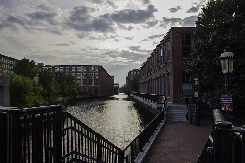 We walk through the UMass Lowell Inn like we own the place and find that the back door leads directly to the Lower Locks. I like how the build of a space, and the materials used, can give a different feel to a place. I’m standing in a state that helped build the U.S. to what it is today and in a city that once prospered with six miles of canals powering ten mill complexes with ten thousand looms. Working conditions might not have been great, but business was booming for a hundred years until competition closed the mills.