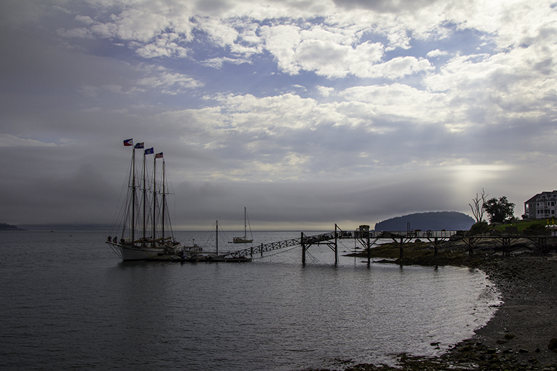 We haven’t forgotten about the dogs and go back south to pick them up. They were asleep in the tent when we got there. North of Bar Harbor is another visitor center – Hulls Cove. We stop in town first to see a guy repainting a building white; a giant lobster holding an ice cream cone; a schooner, the Margaret Todd, with four flags flying – American, Maine, New England, and Philippines; the rainbow of apartments above the shops below; and more offers for seafood and dessert. I can tell why fishermen love this place.