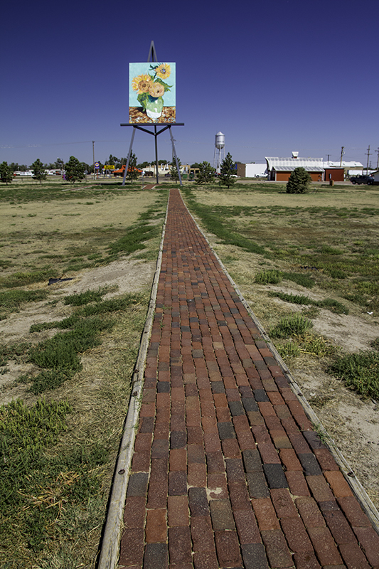 We stop in Hill City (where everyone seems to be over the hill) to buy some snacks. Our next stop won’t be for another hour and 45 minutes. We pull over to put our eyes on the largest Van Gogh replica of Three Sunflowers in a Vase and easel in Goodland, Kansas standing tall at 80 feet – the tallest thing for miles, but not as tall as Mount Sunflower at 4,039 feet. Seeing this art is inspirational and I let Caleb have his second time at the wheel so I can write some sunflower inspired poetry while we drive to Sand Creek Massacre National Historic Site.