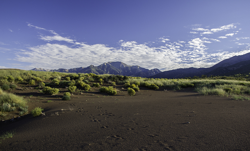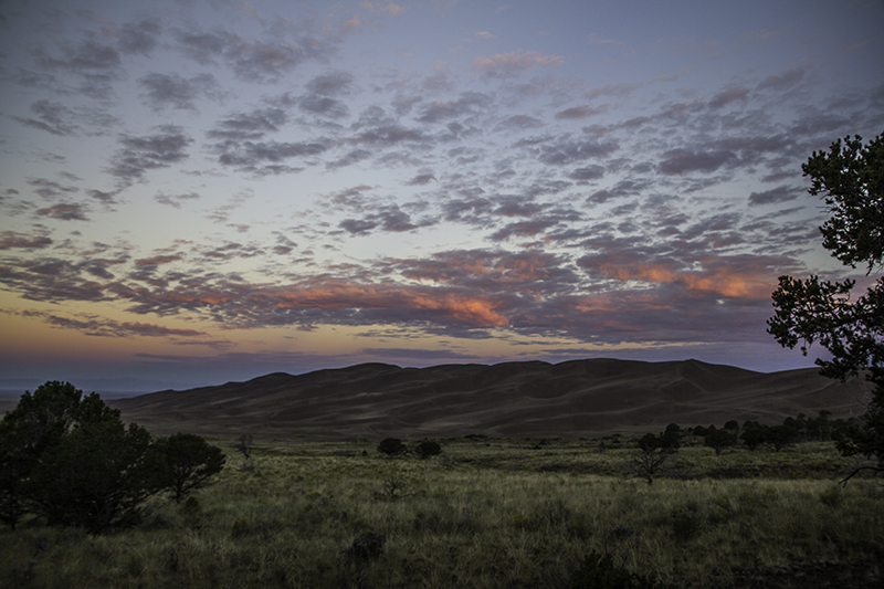 It seems we couldn’t have come across a better camping spot accidentally than we did last night. As the sun begins to rise the tent, with sleeping dogs inside, will remain in the shade. We know hot temperatures will change our ability to see and do for the last few days of our trip. We want to make the most of this cool morning and start it off with a hike on the Dunes Overlook trail. We get to see the blues and purples in the sky as we walk through the green path and see the shades of brown change on the dunes below.