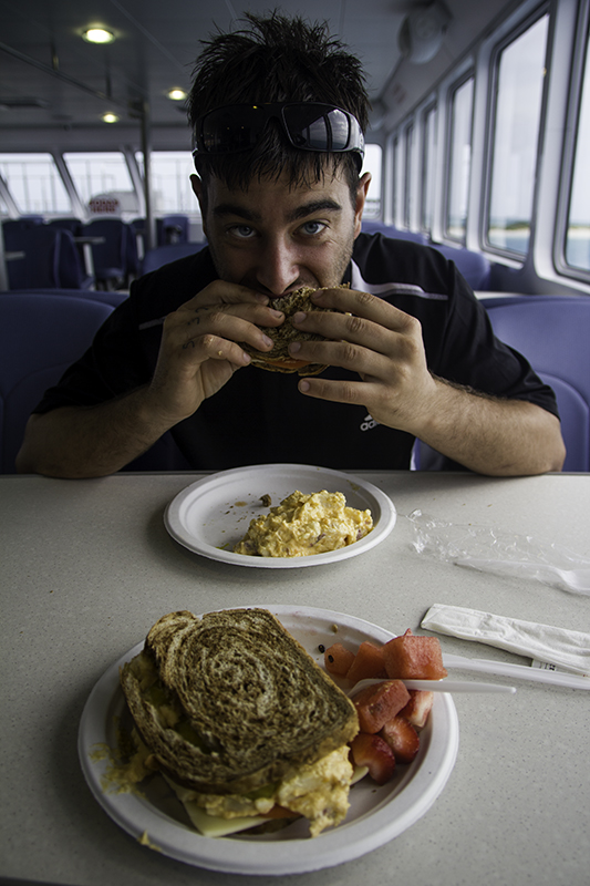 We let our food settle while we sit upstairs and then take one last walk before saying goodbye. We hope to be back in another three years. The crowd returning with us will be a lot more ethnic voices and some pregnant ladies. Before departure Caleb’s iPod will die and he will attempt a nap while I read. With everyone on board we hit the choppy waters of the afternoon – it almost seems the captain is aiming to make it a bouncy ride – I haven’t felt this since being in the navy and it brings back fond memories.