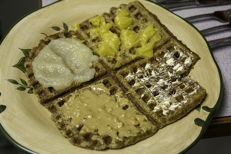 We get to watch the Sunflower Waffles, made with flax, chia, and oats, cook to their edible state in her square cooker and her heart-shaped one. On the counter is a selection of toppings that all make delicious garnishes to my morning meal. I will have peanut butter on one square, apple sauce on another, with peaches on the third, and butter and syrup to finish off my breakfast concoction. There are also mandarins and apples available as sides, but these will not be needed as the protein in the mix will keep us full until dinner.