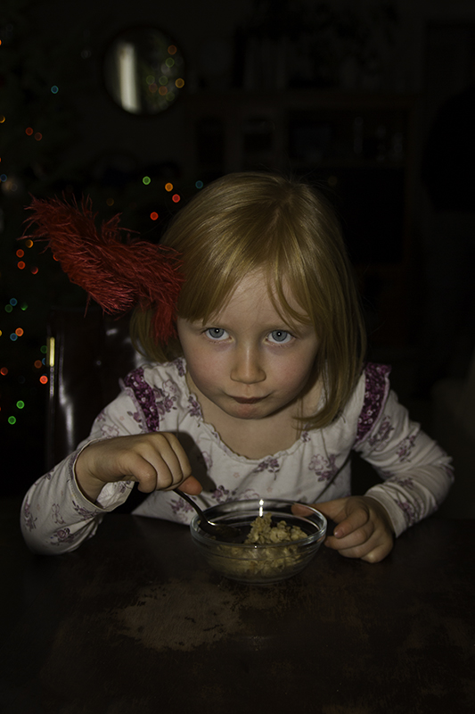 The girls want to choose which bowl to eat out of, who to sit beside and how close they can be, and where to sit – counter or chair. I remember being small enough to sit on the counter and help my mom bake, but this morning includes sibling rivalry and learning to share. Once we’ve all had some oats and dried grapes Sammi decides it’s time to make little children sandwiches. If I were into eating meat and had the bread been baked, not woven, I might have found more of an appetite.