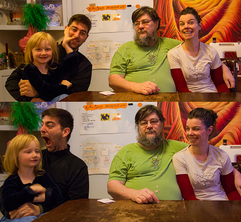 I had picked Sparky up and set him down thinking he was fine. It was Caleb that noticed the swollen lump on his face, the cut on his nose, and the blood that had already stained his shoulder and leg – WTF had I been looking at?! I wanted to panic, but I knew as soon as the bleeding stopped we should be good to go. I was able to get another ‘Caleb with family’ photo, Sammi signed Grandma Terri’s card, and with that in hand we took Jessi to work on our way out-of-town around 8:15 am.