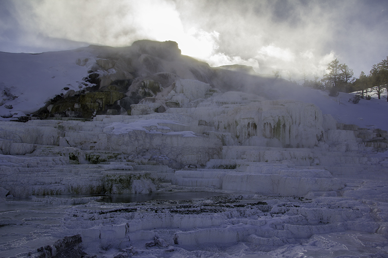 We drive through the small village area and to the first parking lot. The boardwalk has been cleared of snow, for the most part, but it could’ve been covered in black widows or diamondbacks and I wouldn’t have noticed. I was so enamored with the contrast of frozen versus boiling water and the white formations looking bleached versus the colorful areas standing out to their pale surroundings – parts of which were covered in steam. This is a place that I could find religion, a spot to worship the great Earth’s evolution and power to create such beauty using wind, earth, fire, and water.