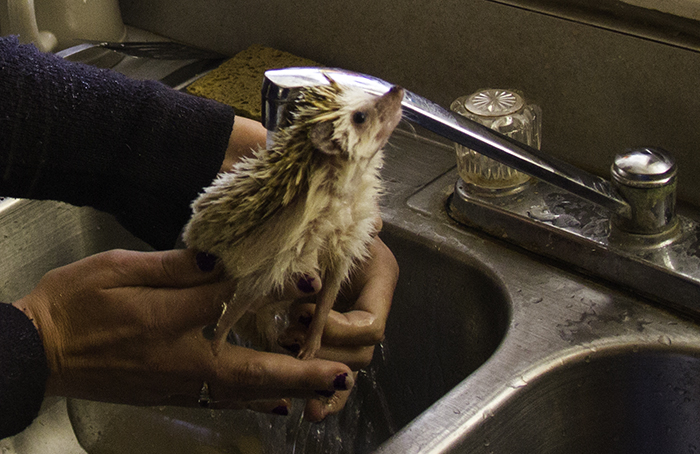 I didn’t know if it was the water or the sunlight that seemed to bring this nocturnal animal to life, but I liked it. I wrapped him in a towel and then set him on the table in the sun to dry. He has such a cute face and the tiniest little feet under his cactus coat that he wears. I wanted to take him home and Ted said I could, but I had to think about moving to Bahrain and that I’m only allowed to bring two pets. That’s a bummer. I could put Harvey in a dog-safe ball and then let them all get exercise.