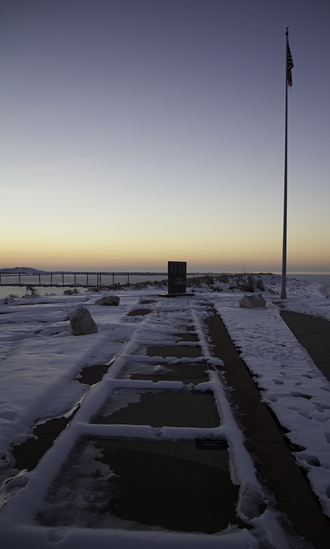 It will be dark soon and I have no idea where dinner or sleep will be yet, so we have to let the dogs out here to pee in a foot or more of snow. There is plenty of plant life springing forth from the snow for incentive, but the windy frozen tundra is cold enough to freeze any bladder for the next few hours. We stop at the Air Force Memorial that seems to have a heated sidewalk. I know that’s what I would want – a time convenience and fancy. We walk down to the water to check on the amount of ice versus salt. Caleb waltzes out on the ice until I tell him that I will call for help – then grab the camera to record us freezing to death.