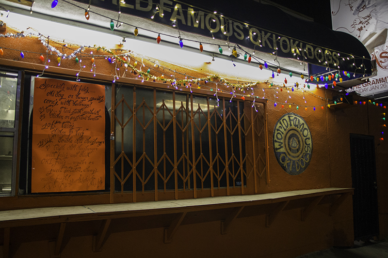 At the car, 5:17 pm, I text Caleb that we are on our way to Oki Dog to pick up his pastrami burrito. At 5:47 pm, I text him again to let him know that we drove to the wrong address (right number, wrong city). It will take us another 30 minutes to drive to the little orange building on Fairfax Ave in West Hollywood. We get two burritos to-go so Mom can try one.