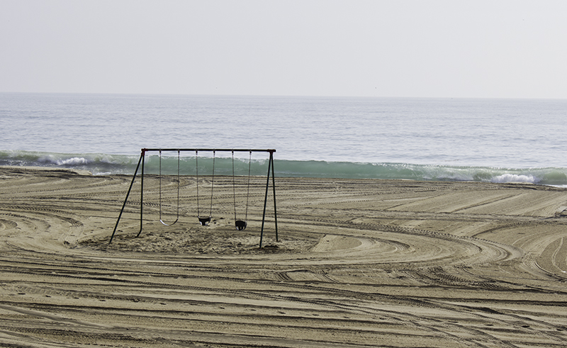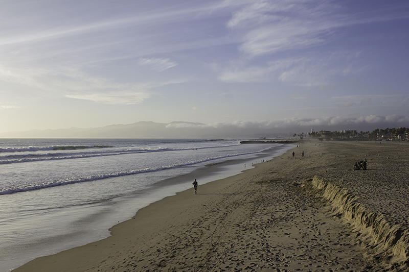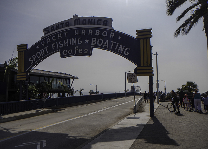 Caleb aired up his tires and then we rode to the end of the wooden pier – enjoying every bump that those boards delivered. There is fishing, kissing, eating, surfing, Ferris wheeling, dancing, instrument playing, singing, and plenty of photo taking going on as people from around the world want to capture this moment – for whatever it means to them. There is sand, surf, sun, construction, restaurants, and gift carts that also catch my eye. We ride our bikes down the boardwalk to the beach, but no toes in the sand, before heading north to the end of Will Rogers Beach where the bikeway ends.
