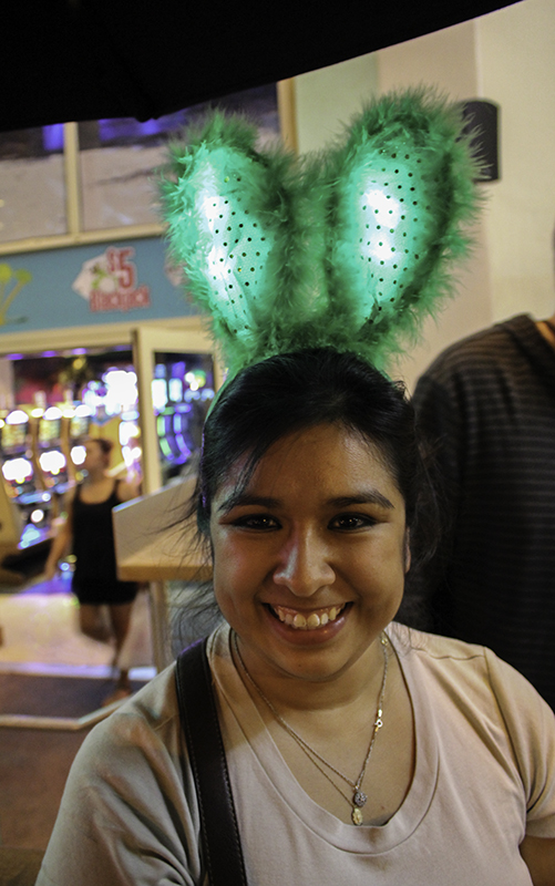 I thought we would start with beers, but we didn’t walk into Beerville, so we ordered from the margarita menu at 8:30 pm. I bought the first round of $10 margaritas and drank a Who’s to Blame. We also ordered free water which is a safe desert requirement with everyone carrying bottles too. People sell them near the escalators outside for a dollar during the day. Our second drink would be thanks to Tom – as would the rest of the drinks for the evening. He bought me a light-up tie and Deanna some flexible green ears that blink and then we joined him and his friends on the patio.