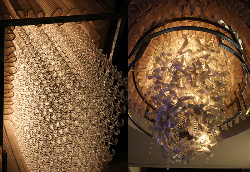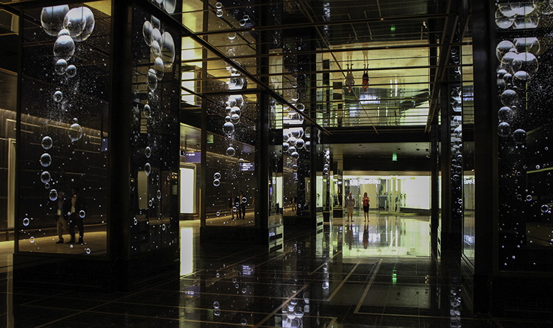 Art, glass, and reflections are everywhere in The Cosmo – and we like it. Something else that’s neat is the u*tique shop – a vending machine where most everything is $20 – rollable flats, a vodka flask, a stuffed rainbow rabbit, a book by Mindy Kaling, shiny sunglasses, and lipstick/mascara emergency kits. Then, we are walking down this hallway when I see a large tank of jellyfish – Wow, would you look at that?! Oh wait, where did it go? We turned around to look for it, thinking we had peeked through an open door, but when we turned around the jellyfish had turned into bubbles.