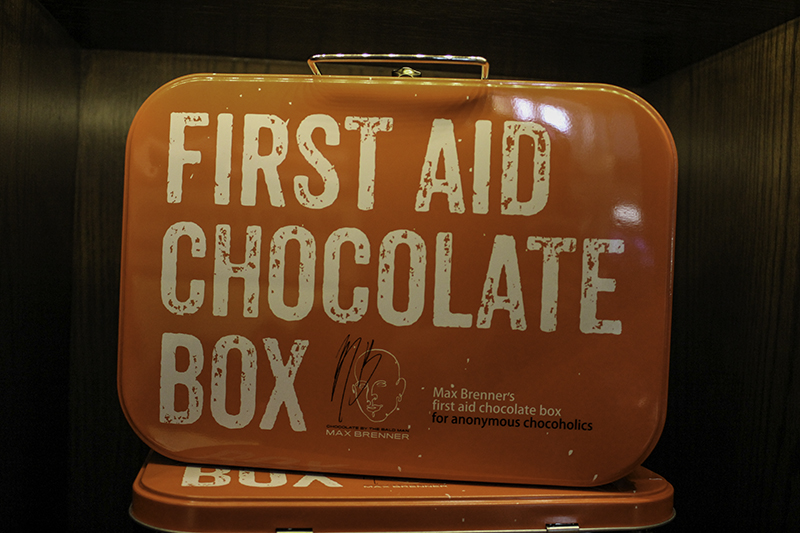 We walk by the tallest H&M I’ve ever seen with manikins that look like they are on a more-clothed spring break and one swinging from the rafters. We walk through Max Brenner: Chocolate by the Bald Man – a store that sells chocolates, emergency tins you can fill, and most everything else you can think of – music, liquor, crepes, coffee, milkshakes, artwork, and fondue. Why didn’t we load our stomachs with food and our arms with bags – we weren’t hungry yet at 2:20 pm, and we wouldn’t be for another two hours.