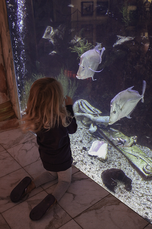 We walked by a large tank full of fish with stripes, spots, yellow tails, unicornfish, stingrays, and apparently ones that talk to three-year old girls. We managed to make it outside, past the friendly gold busker on his lunch break, and back into Caesar’s Palace at the Forum Shops where I’m impressed by the height of the statues and the spiral escalators. There’s plenty of shopping to be done here, but only a few stores will get us inside and even fewer will get us to actually purchase something – Deanna using the lack of luggage excuse and me the husband excuse and both of us using the ‘we don’t want to carry all this around for the next few hours’ excuse.