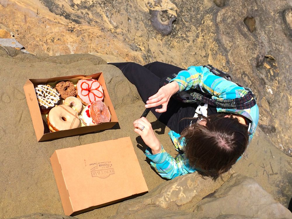 Two o’clock is upon us, the burritos are digested, and we find ourselves at Sunset Cliffs with a box full of donuts. We find parking a few blocks away and are able to secure a spot on the rocky edge to chomp our way through each flavor – our favorites being the blood orange and maple bourbon. Being the adventurous type we take our box and walk a ways to the parking lot with a rope access to the rocks and water below. It would’ve continued to be relaxing and enjoyable if we hadn’t been joined by college kids and military guys.