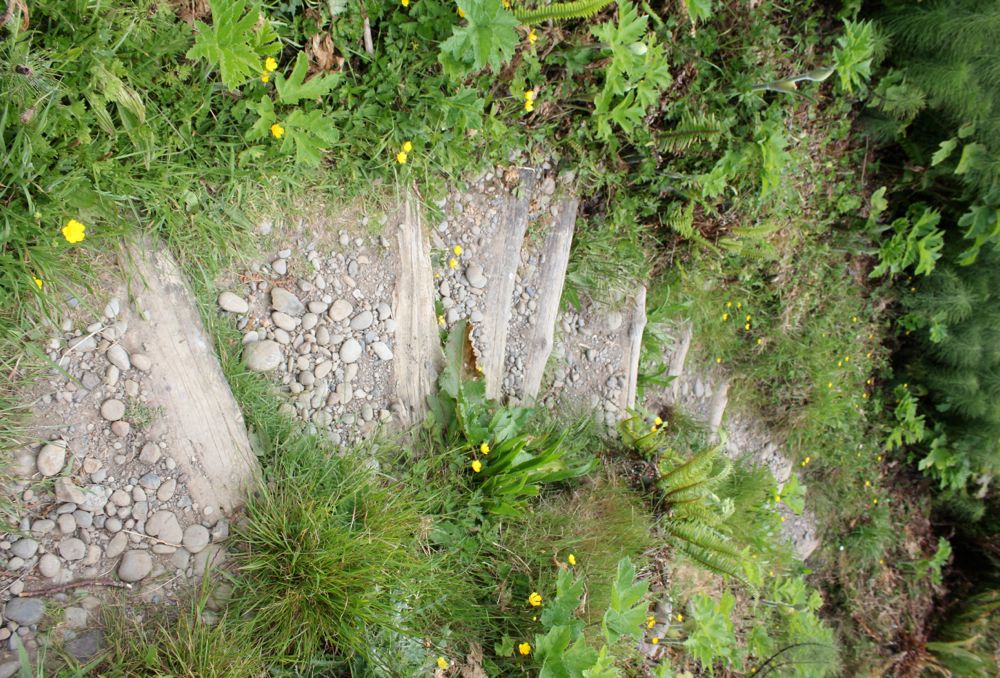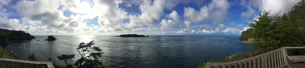 We continue on, past the homemade “up with hope, down with dope” signs, past the shiny water and the wet trees, and around the 20 and 35 mph turns to the cape trail parking lot. The sign at the trailhead says it’s a half mile one-way. There are pieces of trees, layers cut horizontally, set on the trail along with tree roots and then a long boardwalk that splits in many directions to give you a varied view of the cape – the islands, the sea caves, the boats nearby, and Canada in the distance.